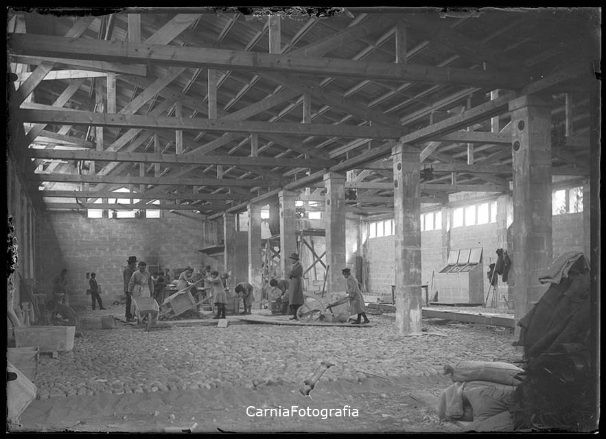 Alcuni allievi cementisti della Regia Scuola d'Arte Professionale “Albino Candoni” di Tolmezzo sono ritratti durante le attività di laboratorio; si distinguono diversi insegnanti. La pavimentazione del laboratorio, in ciottoli di fiume, è stata probabilmente realizzata dagli allievi.