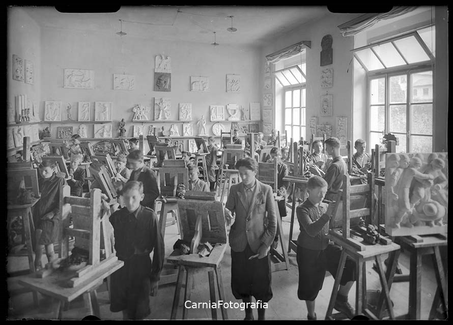 Alcuni allievi falegnami ebanisti della Regia Scuola d'Arte Professionale “Albino Candoni” di Tolmezzo sono ritratti durante le attività di laboratorio; ogni ragazzo, ripreso dietro ad un cavalletto, è impegnato a modellare una scultura in bassorilievo. Numerose sculture sono esposte sulle pareti.