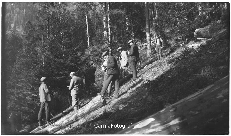 Degli uomini sono ritratti mentre prendono nota del numero di tronchi.