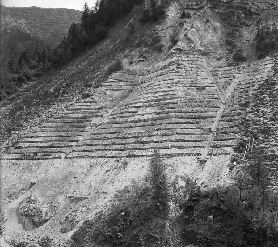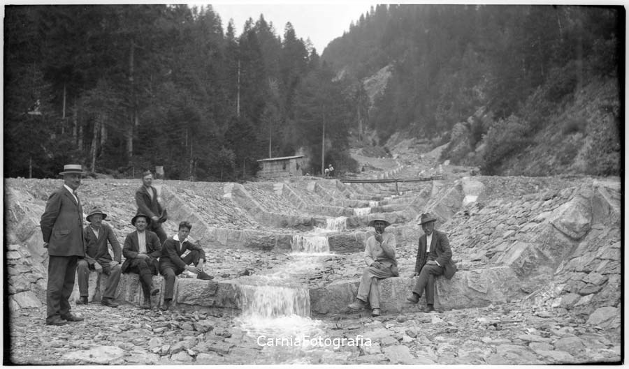 Gruppo di uomini sul greto del torrente. Nell'alveo sono state realizzate briglie in pietra