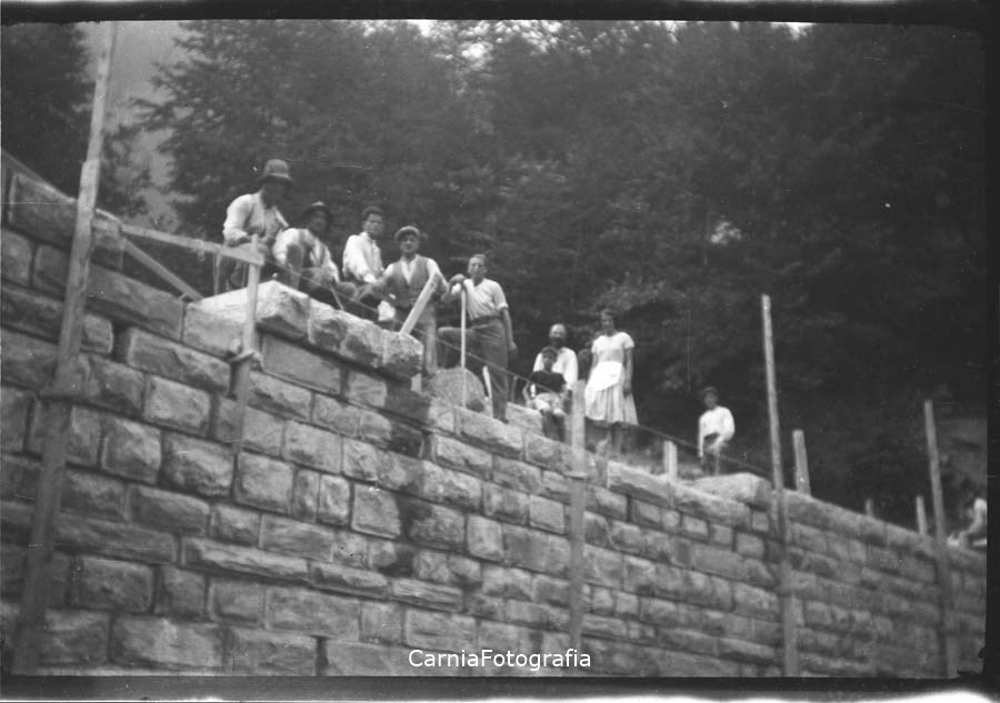 Dei manovali sono ritratti in un momento di sosta dalla costruzione delle briglie sul rio del Mus a Priola; il fotografo li ritrae dal basso; sulla destra sono visibili anche una donna e un bambino.