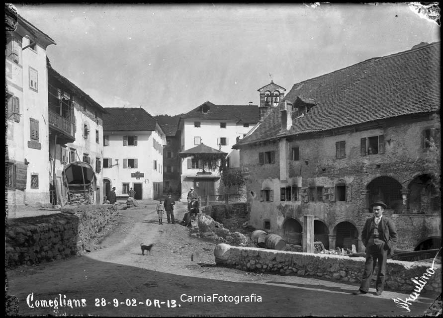 Veduta del centro di Comeglians: in primo piano la strada sterrata e le prime case del paese. Sulla destra è ritratto un uomo elegantemente vestito che tiene le mani in tasca ed è rivolto al fotografo; alle sue spalle un'imponente casa ad archi. Altre persone percorrono la strada, alcune sono sedute sul muretto di sassi che fiancheggia la strada. Tra le case spunta il campanile della chiesa di San Nicolò vescovo