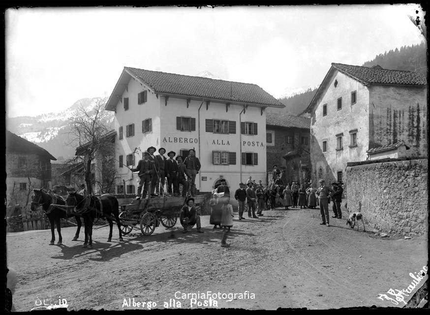 Veduta dell'albergo alla Posta di Sutrio e della piazza antistante gremita di persone; sei uomini sono in piedi su di un carro trainato da due cavall. A destra è visibile un alto muro ed altre case del paese.