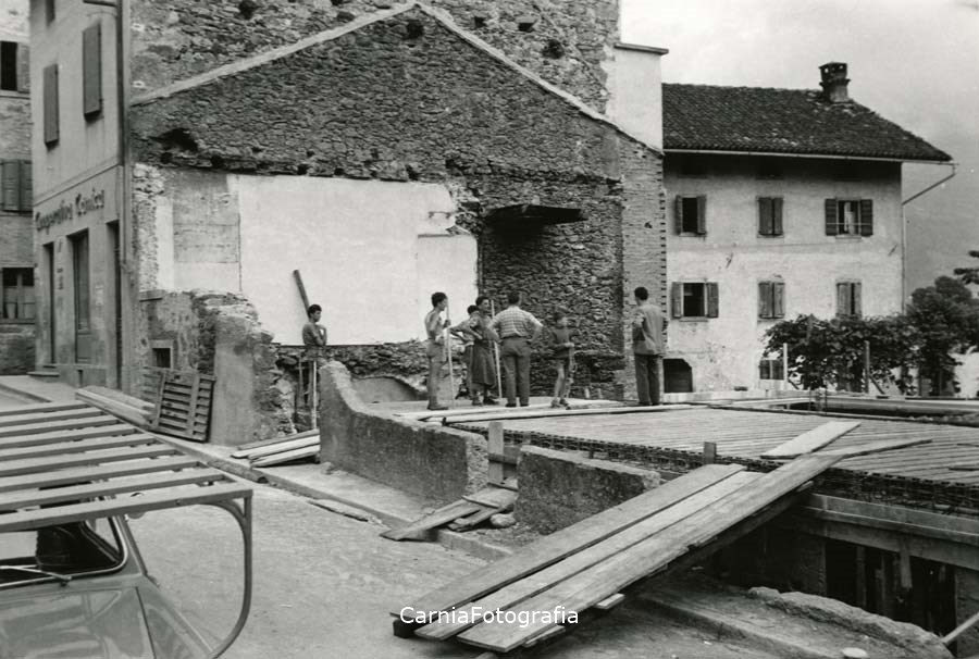 Costruzione della bottega e casa di Tenno e Nanto di fianco alla sede della Cooperativa Carnica. Operai con attrezzi in mano e supervisori; tra loro un bambino.