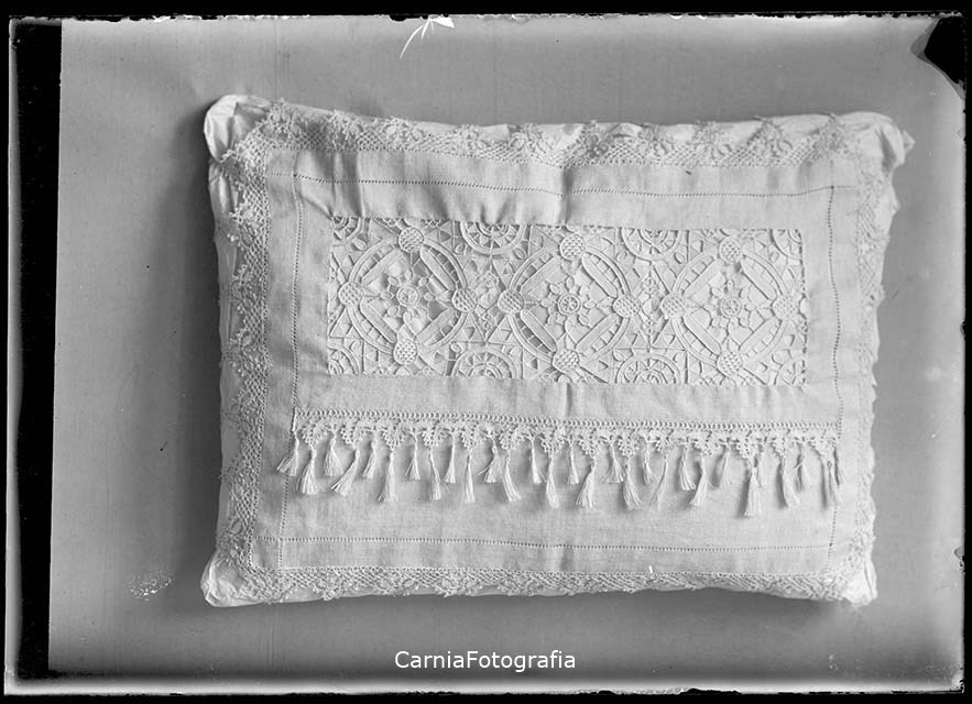 Esposizione di un cuscino finemente ricamato; il cuscino è stato realizzato dagli allievi della Regia Scuola d’Arte Professionale "Albino Candoni" di Tolmezzo.