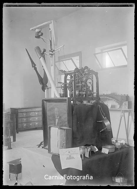 Esposizione di un orologio meccanico da torre; l’orologio, così come documentato da un foglio visibile in primo piano, è stato realizzato dalla ditta Fratelli Solari di Pesariis di Prato Carnico (Udine). Sono presenti, inoltre, altri oggetti: un quadro, alcuni “bronzìns” (pentole tripodate in bronzo), ecc. Michele Gortani, per qualificare ed arricchire la Regia Scuola d’Arte Professionale "Albino Candoni" di Tolmezzo, donò all’istituto molti oggetti di arte ed artigianato locali di notevole valore etnografico con l’intento di educare il gusto e la mano degli allievi alle linee e ai motivi ornamentali della tradizione locale. Questi oggetti, sicura fonte di ispirazione per gli insegnanti e gli allievi dell’istituto, consentirono l’apertura all’interno della scuola del Museo d’Arte Paesana Carnica; il museo, nel 1937, fu trasferito in un’altra sede.