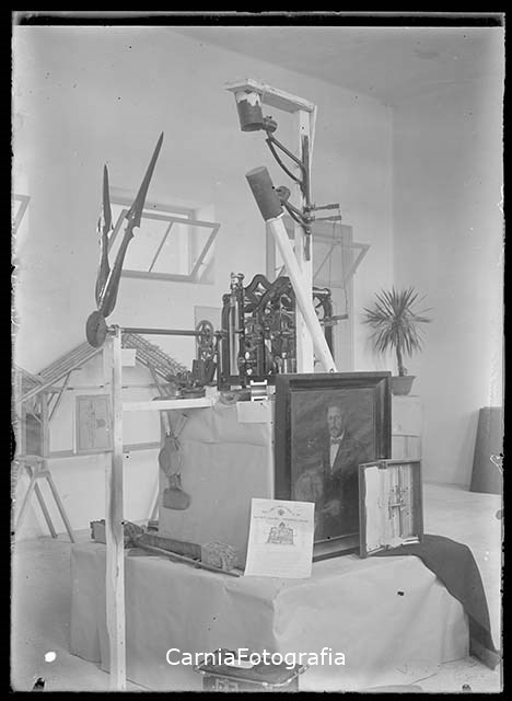 Esposizione di un orologio meccanico da torre; l’orologio, così come documentato da un foglio visibile in primo piano, è stato realizzato dalla ditta Fratelli Solari di Pesariis di Prato Carnico (Udine). Sono presenti, inoltre, altri oggetti: un quadro, alcune roncole, ecc. Michele Gortani, per qualificare ed arricchire la Regia Scuola d’Arte Professionale "Albino Candoni" di Tolmezzo, donò all’istituto molti oggetti di arte ed artigianato locali di notevole valore etnografico con l’intento di educare il gusto e la mano degli allievi alle linee e ai motivi ornamentali della tradizione locale. Questi oggetti, sicura fonte di ispirazione per gli insegnanti e gli allievi dell’istituto, consentirono l’apertura all’interno della scuola del Museo d’Arte Paesana Carnica; il museo, nel 1937, fu trasferito in un’altra sede.