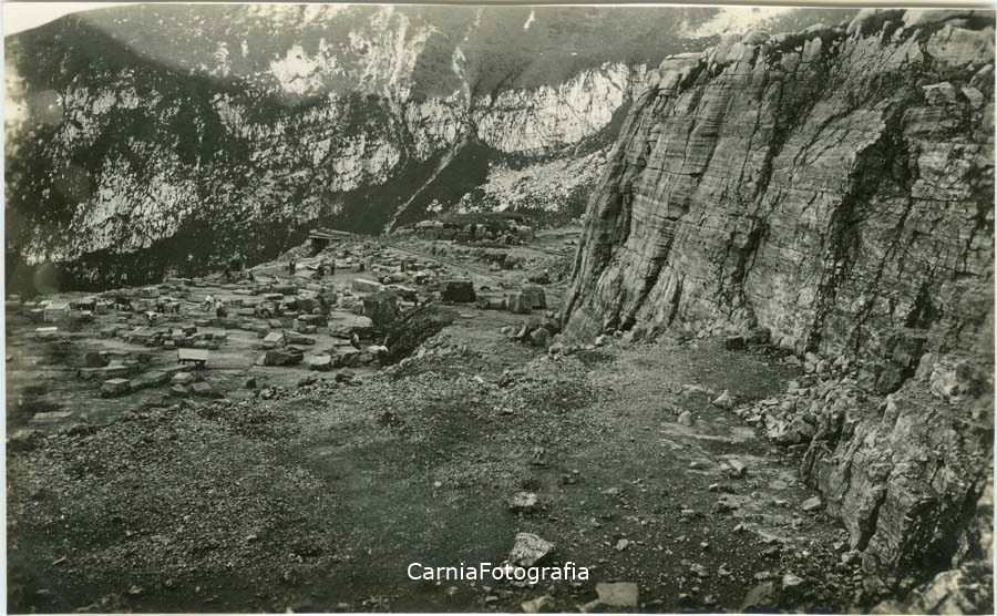 Veduta della cava di marmo "Lavoreit Ros" sul versante nord-est del monte Lovinzola; diversi operai stanno lavorando. Sullo sfondo sono visibili i binari della decauville.