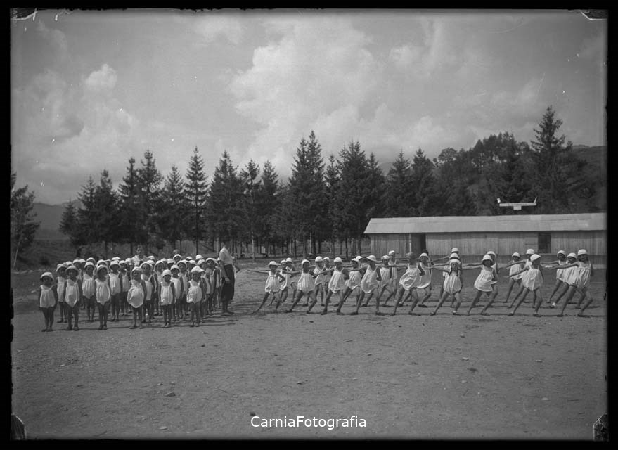 Numerosi bambini, con costume e cappellino, posano insieme a due giovani educatori presso la colonia elioterapica di Enemonzo, in prossimità del greto del fiume Tagliamento. I fanciulli stanno eseguendo un esercizio ginnico.