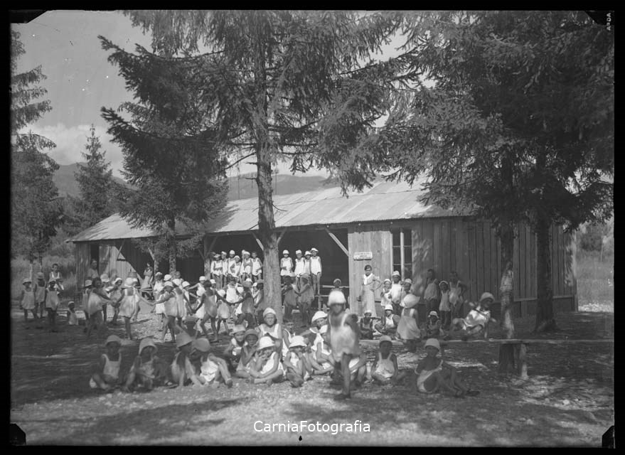 Numerosi bambini, con costume e cappellino, posano insieme a diverse educatrici presso la colonia elioterapica di Enemonzo, in prossimità del greto del fiume Tagliamento, durante un momento di svago. Una targa, affissa alla baracca, reca la scritta: “LA COLONIA SI PUÒ/ AMMIRARE/ MA NON DISTURBARE”.