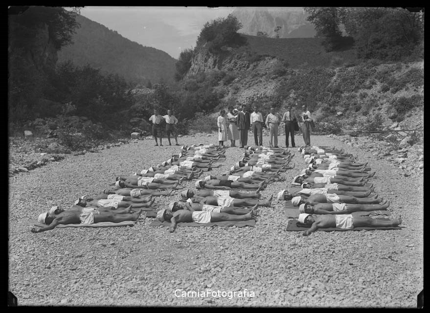 Numerosi bambini distesi a terra con il costume e il cappellino posano durante il bagno di sole in prossimità del greto del fiume Tagliamento presso la colonia elioterapica di Enemonzo. Diverse persone osservano e sorvegliano i bambini.