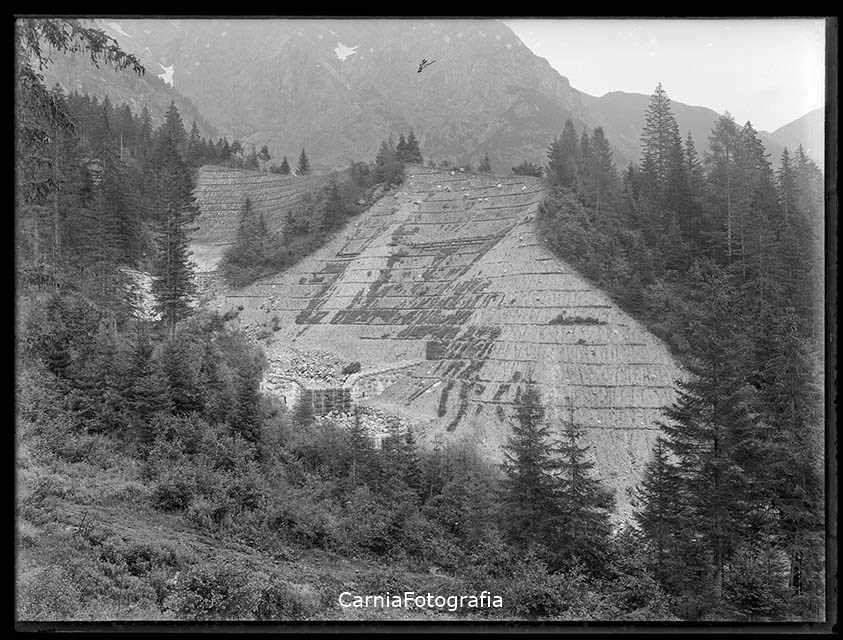 Rio Chianaletta (affluente del rio Stalis): documentazione di un versante montano dopo gli interventi di sistemazione idraulico-forestale. Sul versante sono visibili graticciate, palificata in legname e pietrame e palizzate in legname; la Milizia Forestale è intervenuta, inoltre, con il taglio di piante. In alveo sono presenti briglie e avanbriglie in pietrame e malta e difese spondali in grossi massi realizzate prima dell'intervento sulla pendice.
