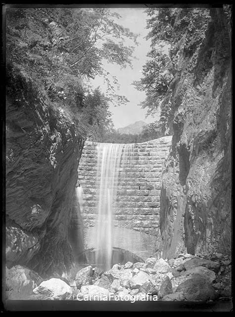 Rio Fuina: documentazione di un versante dopo gli interventi di sistemazione idraulico-forestale. Nell'alveo è presente una briglia in pietrame e malta; sull’ala destra della briglia, si vede una pietra con inciso l’anno di costruzione (la briglia è stata realizzata nel 1922).