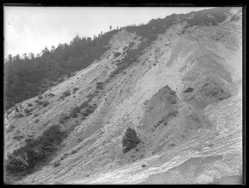 Rio Giaf-Lavinal: documentazione di un versante in frana in destra orografica prima degli interventi di sistemazione idraulico-forestale. La frana è denominata F.