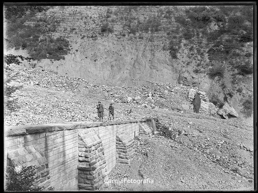 Rio Miozza: documentazione di un versante montano dopo gli interventi di sistemazione idraulico-forestale. Sul versante, in secondo piano, sono visibili graticciate, una palificata in legname e pietrame e palizzate in legname; il versante è in fase di rimboschimento naturale. Nell'alveo è presente una briglia in pietrame e malta con contrafforti (probabilmente realizzata in un intervento precedente); l'ala sinistra della briglia è distrutta. Due guardie della Milizia Forestale, in piedi sulla briglia, forse stanno valutando i danni dell'alluvione del 1934: al piede del versante sistemato, infatti, si nota un'erosione da alluvione torrentizia. La didascalia annotata sull'etichetta che accompagna il negativo è errata: nell'etichetta la frana è denominata B ma in realtà corrisponde alla frana denominata E.