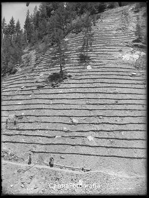 Rio Orteglas: documentazione di un versante montano durante gli interventi di sistemazione idraulico-forestale. Sul versante sono visibili graticciate, una palificata in legname e pietrame, palizzate in legname, muri in pietrame e un sentiero di servizio. Si vedono tre uomini e una donna, quest'ultima porta una gerla sulle spalle. Gli operai stanno lavorando con pale e picconi. La frana è denominata Queste Arsicce.