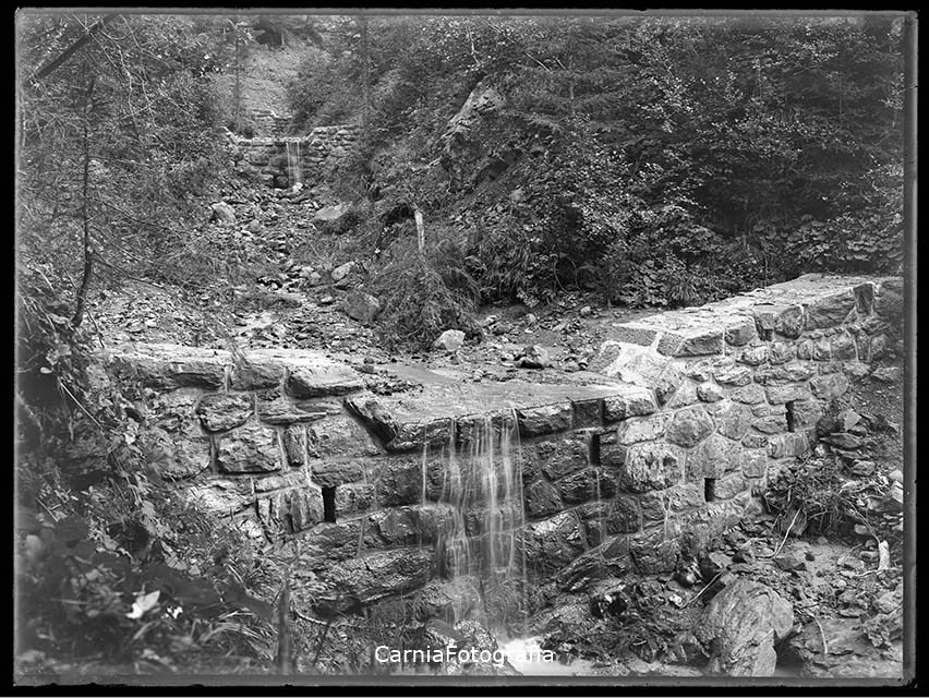 Rio Paluz (affluente del rio Minischitte): documentazione di un versante montano durante gli interventi di sistemazione idraulico-forestale. Sul versante sono visibili alcune graticciate. Nell'alveo sono presenti briglie in pietrame e malta a gaveta trapezia.