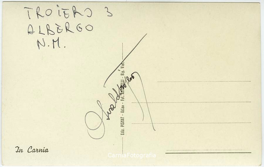 Ritratto in esterno a figura intera di due donne con l'abito tradizionale carnico; le modelle sono ritratte mentre raccolgono fiori in un prato. Sullo sfondo, si vede la chiesa di Sant'Osvaldo re e martire di Sauris di Sotto. La modella sulla destra è Aurelia Frucco.