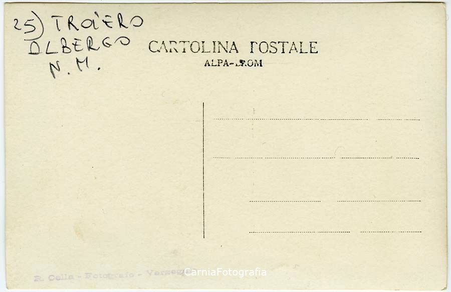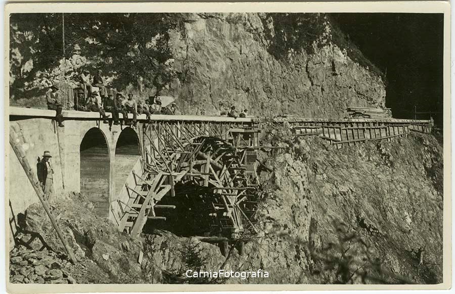 Documentazione dei lavori di costruzione della strada provinciale 73 del Lumiei che collega Ampezzo a Sauris seguendo la forra del torrente Lumiei; questa strada fu costruita, tra alterne vicende, dal 1919 al 1934 (fino ad allora lungo la forra si snodava soltanto un ardito sentiero). Numerosi operai posano in prossimità di un ponte in costruzione.