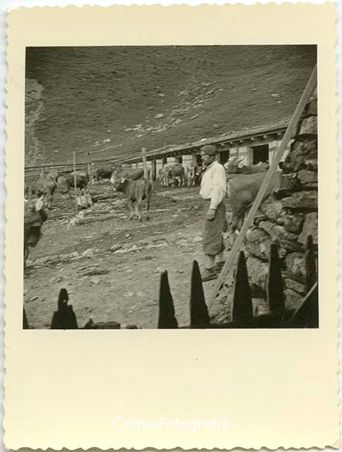 L'alpeggio in una malga del comprensorio di Sauris. La casera ospita diverse mucche. In primo piano si vede un uomo, probabilmente il malgaro.