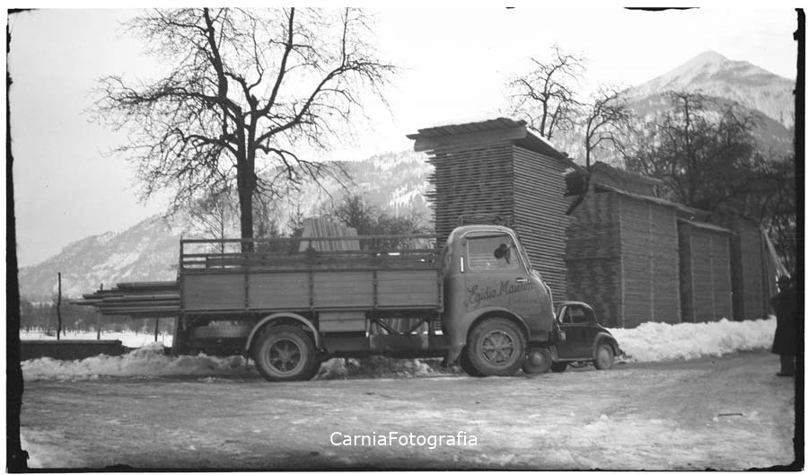 Veduta del leganeme di una segheria accatastato; a lato della strada un autocarro ed un'automobile.