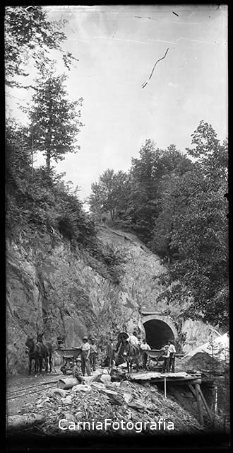 Operai ripresi durante la costruzione di una galleria montana subito fuori dall'abitato di Comeglians