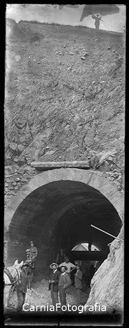 Operai ripresi durante la costruzione di una galleria montana subito fuori dall'abitato di Comeglians