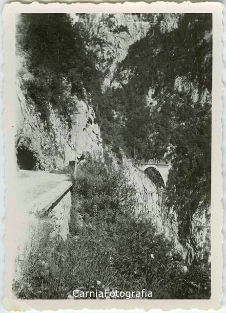 Veduta di un tratto della strada provinciale 73 che collega Ampezzo a Sauris seguendo la forra del torrente Lumiei; questa strada fu costruita, tra alterne vicende, dal 1919 al 1934 (fino ad allora lungo la forra si snodava soltanto un ardito sentiero). In primo piano, sulla sinistra, si nota l’imboccatura della galleria denominata Pala Pelosa (la galleria è lunga 314 metri). In secondo piano, si vede il Ponte del Bûs sul Lumiei, struttura in cemento armato ad arcata unica, lungo un centinaio di metri e alto sull'alveo 105 metri.
