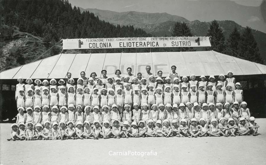 Gruppo di bambine in posa nel piazzale della colonia elioterapica di Sutrio; tutte indosano un completo e copricapo bianco. In ultima fila degli adulti.