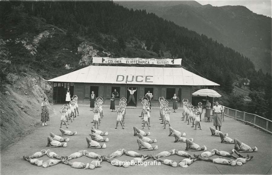 Gruppo di bambine esegue degli esercizi ginnici nel piazzale della colonia elioterapica di Sutrio; tutte indosano un completo e copricapo bianco.