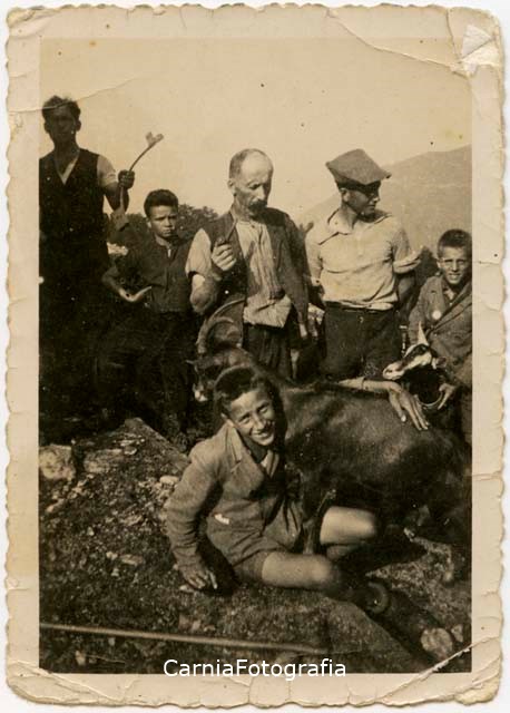 Ritratto di gruppo in esterno a figura intera. Sono riconoscibili Luigi Mazzolini (al centro con la pipa in mano) e Giacomo Mazzolini (a destra, con il berretto). Il ragazzo in primo piano abbraccia una capra.