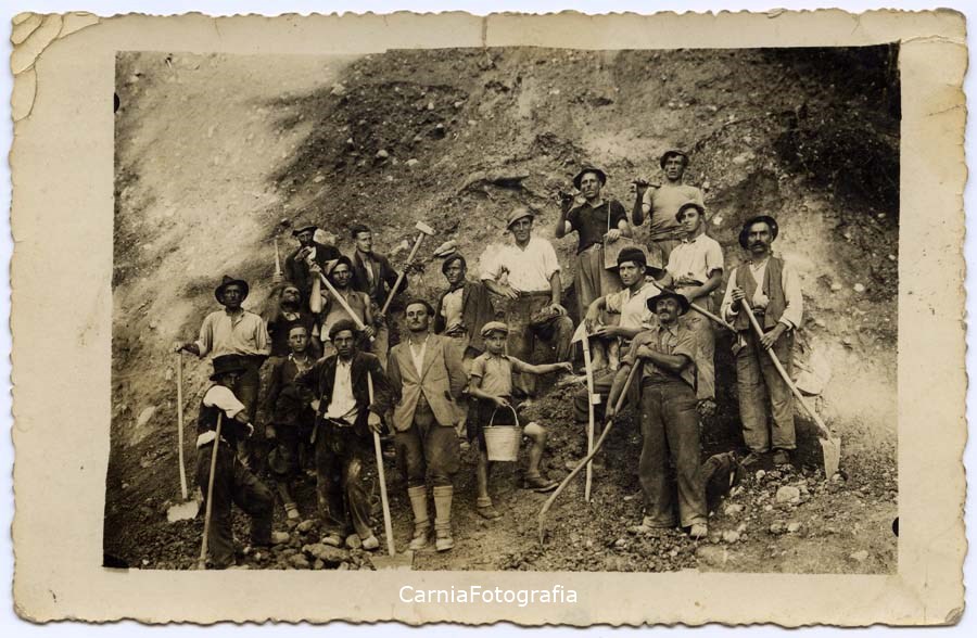 Ritratto di gruppo in esterno a figura intera. Diversi uomini hanno tra le mani gli attrezzi da lavoro; si tratta probabilmente di una squadra di minatori. Al centro della comitiva c’è una bambino con un secchio in mano.