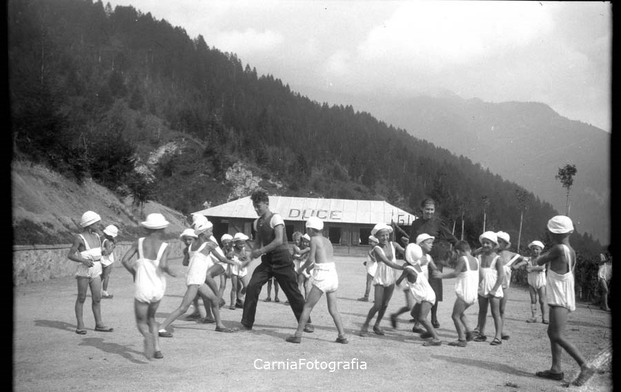 Un gruppo di bambini con al divisa ginnica di "figlio della lupa" gioca nel piazzale della colonia elioterapica di Sutrio. Con loro anche una donna ed un ragazzo.