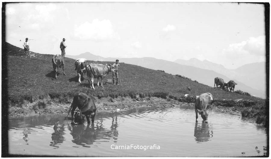 Delle vacche si stanno abbeverando ad un laghetto alpino, altre pascolano nei prati circostanti; con loro i malgari muniti di bastoni.