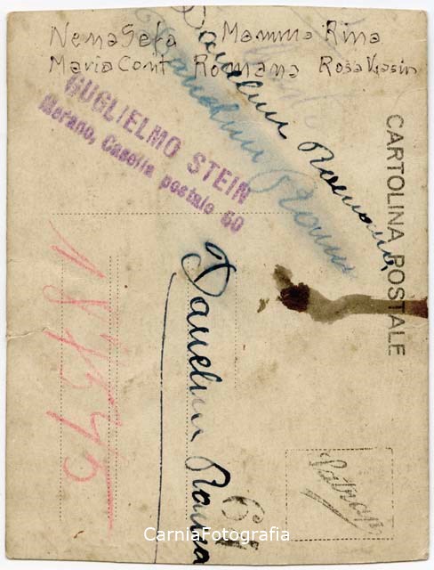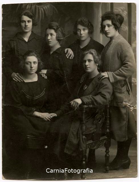 Ritratto di gruppo in studio a figura intera. E’ riconoscibile Maria Maddalena Danelon (in piedi, seconda da sinistra). Alle spalle fondale dipinto con motivi architettonici e floreali.