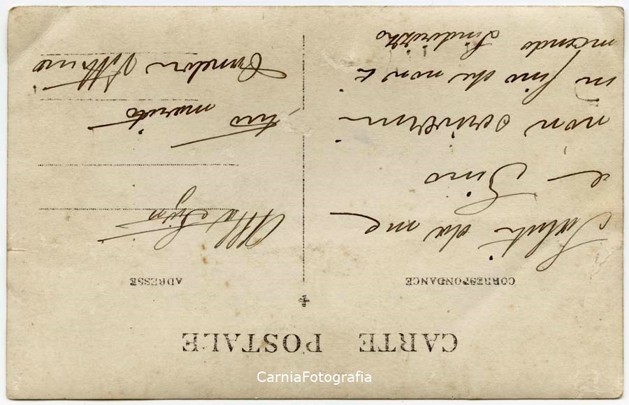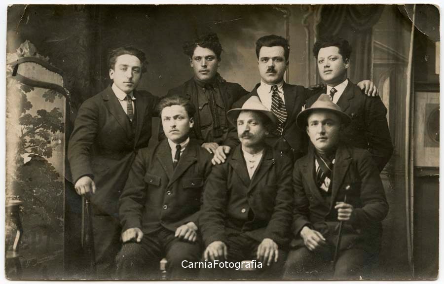 Ritratto di gruppo in studio a figura intera. Sono riconoscibili Valentino Danelon (seduto, al centro) e Gino Danelon (in piedi, primo da sinistra). Alle spalle fondale dipinto con motivi architettonici e floreali.