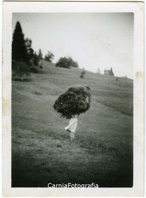 Ritratto in esterno a figura intera. Virginia Fachin è stata fotografata mentre trasporta sulle spalle un pesante carico di fieno.