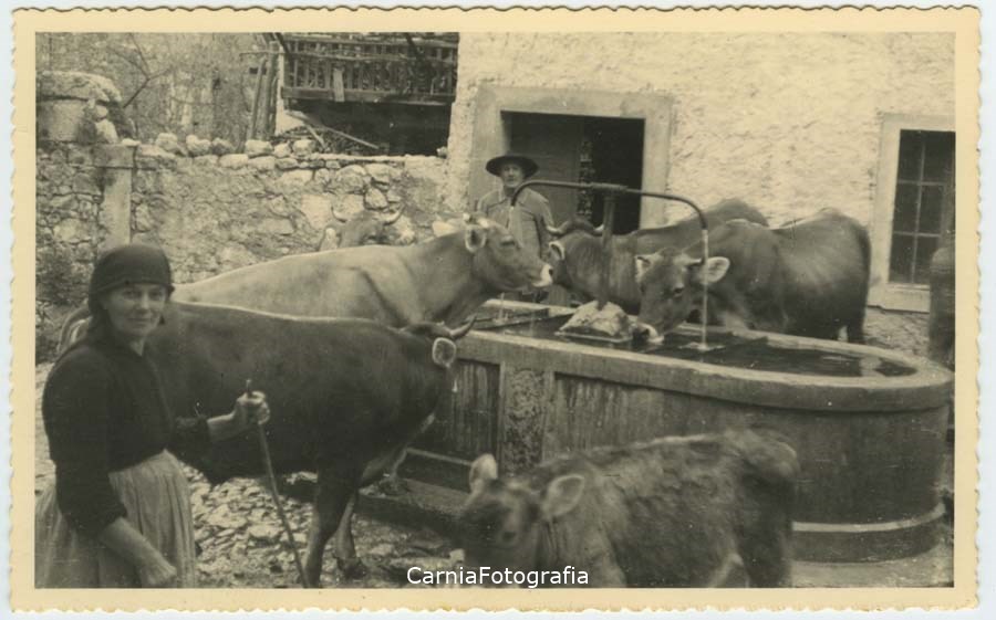 Alcune vacche si stanno abbeverando alla fontana. Sullo sfondo il muro di un'abitazione.