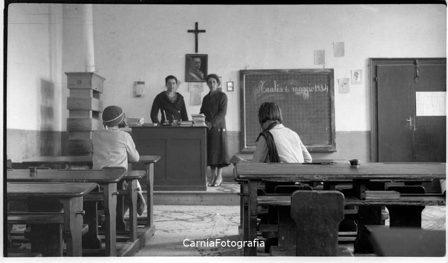 Vista dell'interno di una scuola ed in particolare di una classe con banchi e cattedra; sulla lavagna si legge la scritta "Tualis 6 maggio 1934 ricordo". Nella stanza sono presenti due donne alla lavagna rivolte al fotografo e altre due sedute al primo banco sono ritratte di spalle.