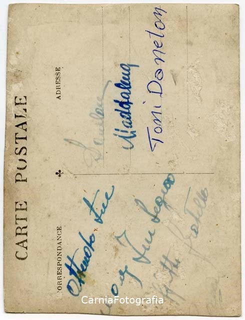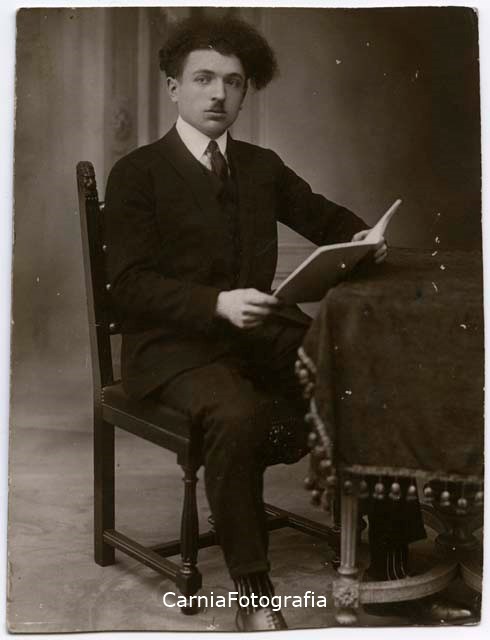 Ritratto in studio a figura intera di Antonio Danelon. Antonio, seduto, appoggia la mano sinistra su un tavolino; tra le mani ha un libro. Alle spalle fondale dipinto con motivi architettonici.