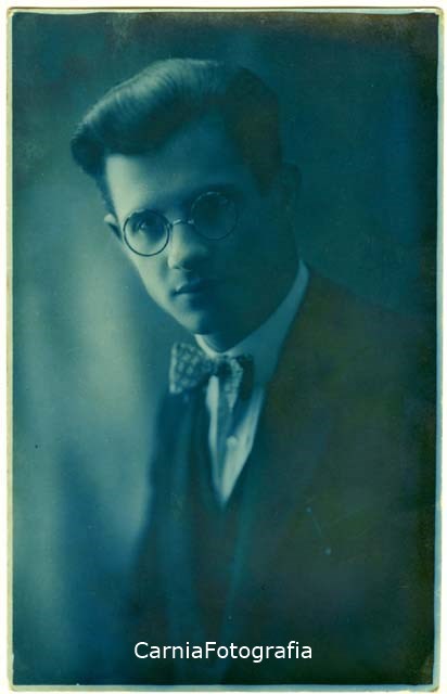 Ritratto maschile in studio a mezzo busto. L’uomo, elegantemente vestito, porta gli occhiali.