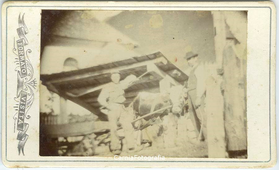 Ritratto in esterno a figura intera di due uomini. Questi posano accanto ad una mucca; la mucca sta trainando un carretto, probabilmente usato per il trasporto di materiale. Alle loro spalle, si vedono una tettoia e parte di un'abitazione.