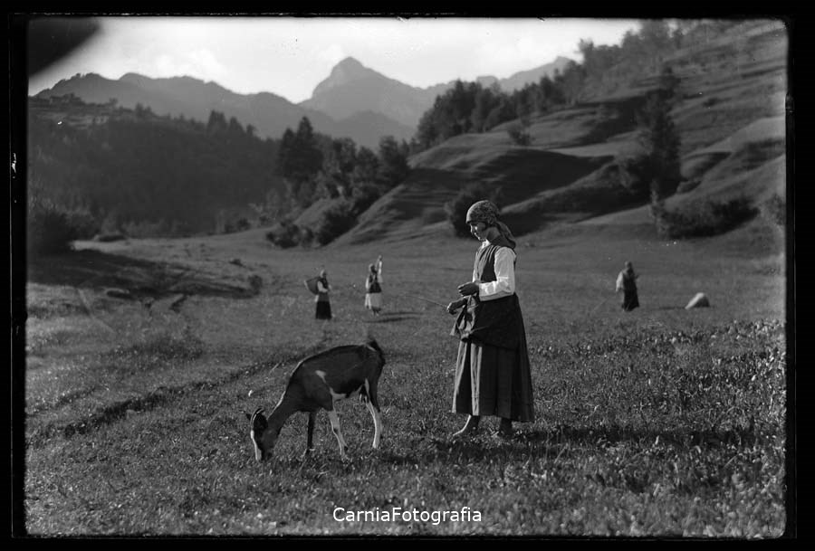 Ritratto di donne, con il tradizionale abito carnico, presso Enemonzo: una ragazza, in primo piano, fa pascolare una capra mentre, in secondo piano, tre donne sembrano impegnate a raccogliere il fieno. La prima modella da destra è Aurelia Frucco. Questa fotografia risale probabilmente ai primi anni Trenta del Novecento: Umberto Antonelli, infatti, tra il 1934 e il 1935 cede allo studio fotografico Luigi Pignat 110 negativi realizzati a Tarcento e in Carnia; con questi negativi lo studio fotografico Luigi Pignat realizza l’illustre serie editoriale "Paesaggi e Costumi del Friuli”.