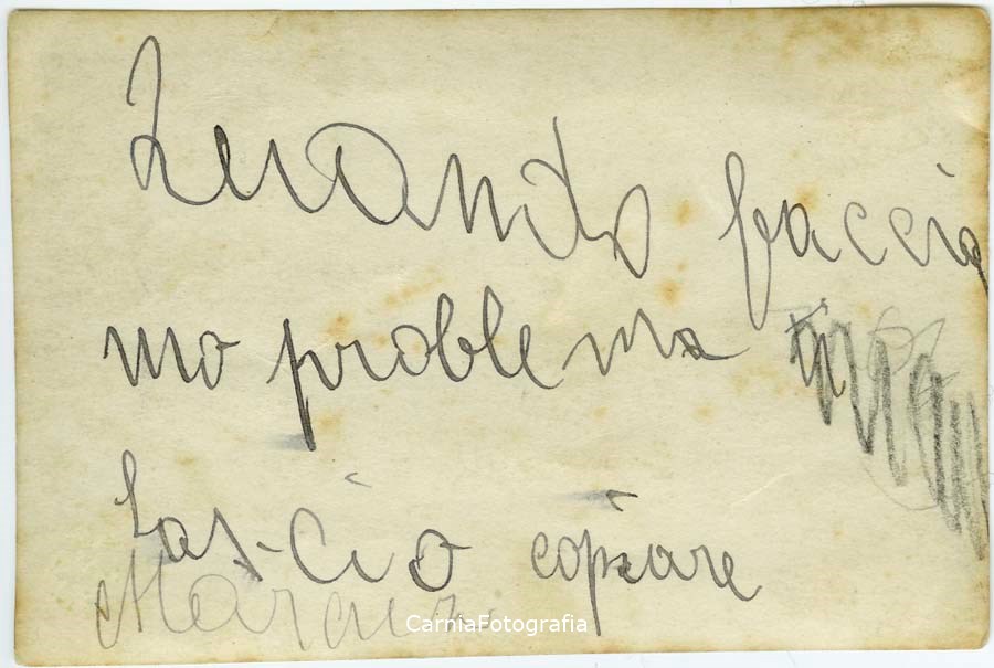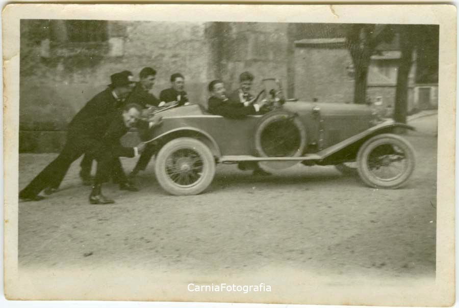 La fotografia è stata realizzata in occasione del matrimonio di Giovanni Pascoli. Ciro Pascoli, fratello di Giovanni, posa alla guida di un'automobile insieme ad altri sei invitati. L'automobile, come riportato da una nota manoscritta presente sul verso di un'altra fotografia realizzata nella medesima occasione, è una Citroën (casa automobilistica francese).