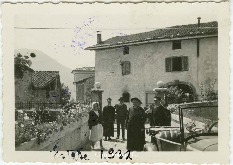 La fotografia è stata probabilmente realizzata in occasione di una visita pastorale: al centro, infatti, posano alcuni sacerdoti. In primo piano, sulla destra, parte di un’automobile.
