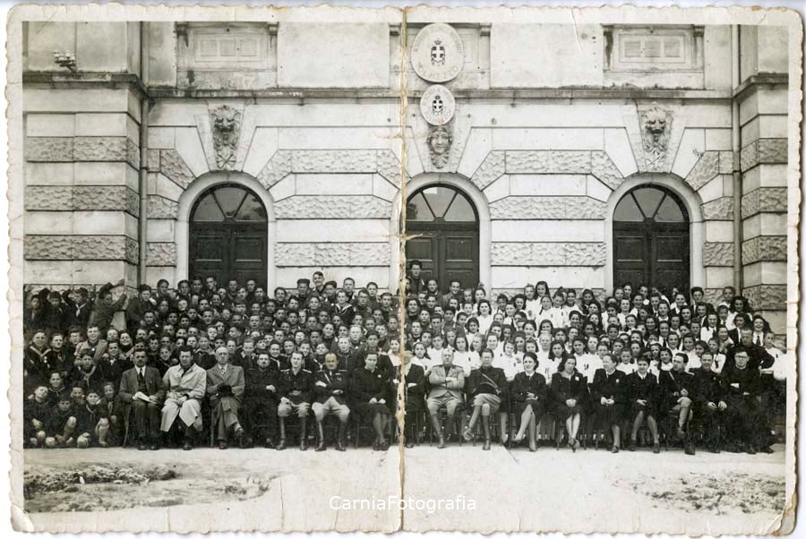 Numerosi bambini disposti su diverse file posano insieme agli insegnanti presso il cortile esterno della scuola. A sinistra, il quarto bambino della seconda fila partendo dall'alto è Biagio Valle, l'unico senza divisa. Al di sopra della porta centrale d’ingresso di palazzo Spinotti si vedono due ovali, entrambi con lo stemma del comune di Tolmezzo: nell’ovale superiore si legge “R. ISTITUTO TECNICO INFERIORE/ TOLMEZZO” mente nell’ovale inferiore si legge “R. SCUOLA MEDIA/ TOLMEZZO”. Biagio Valle è fratello di Maria Pia Valle (1936), proprietaria della fotografia.