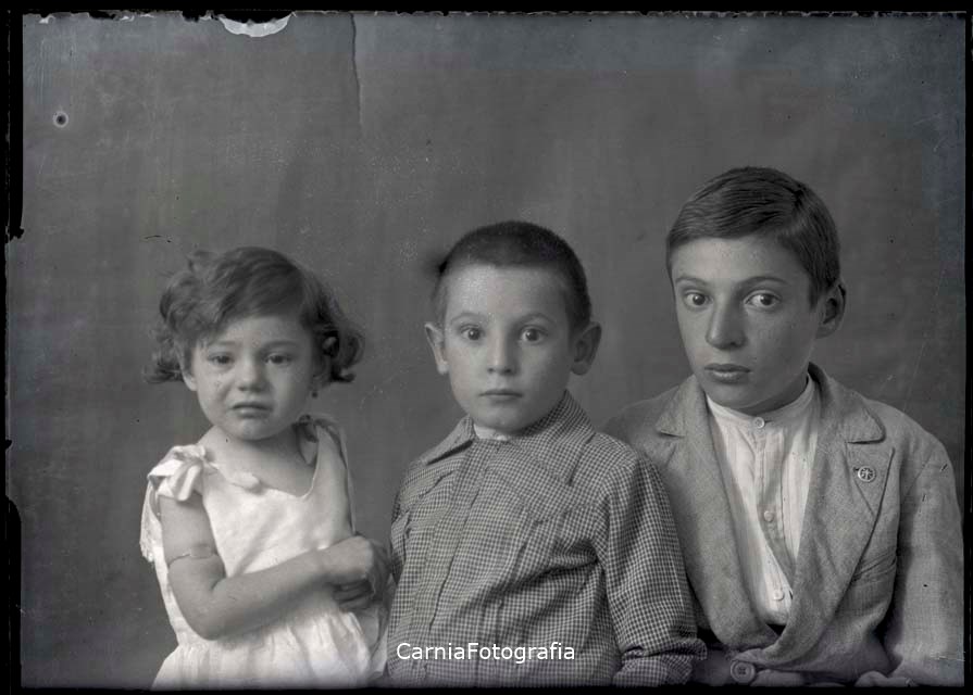 Ritratto di gruppo in studio a mezzo busto. Giovanni Solari ritrae tre bambini: posano, da sinistra verso destra, Alma Melotti, Giuseppe Melotti e Adelchi Melotti. La fotografia è stata realizzata presso lo studio fotografico di Luigi Monaci.