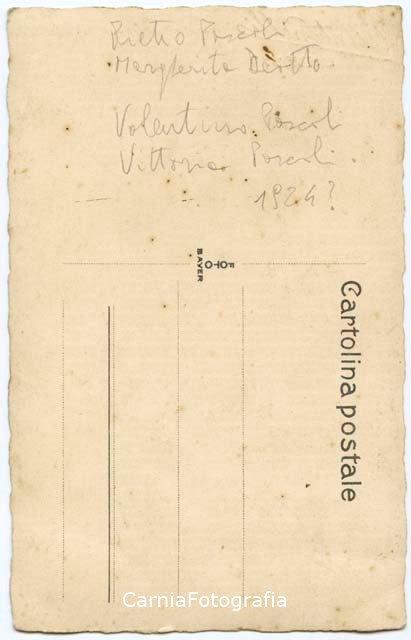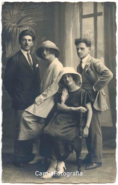Ritratto in studio a figura intera di Pietro Pascoli, primo da destra, con la moglie Margherita Deotto, seconda da destra. Questi sono ritratti insieme ad una coppia di amici. Il gruppo posa davanti ad un fondale dipinto. Pietro Pascoli e Margherita Deotto sono i genitori di Maria Caterina Pascoli, proprietaria della fotografia.