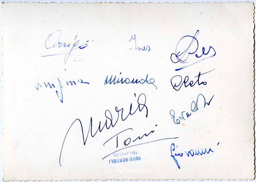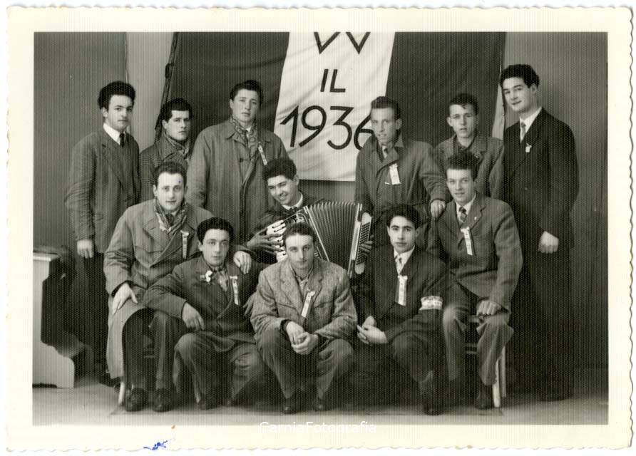 Ritratto in studio dei coscritti del 1936 del comune di Verzegnis. Sono riconoscibili Luciano Cella, in piedi primo da sinistra, Antonio Marmai, al centro con la fisarmonica, e Evaldo Marzona, in piedi primo da destra. Quest’ultimo è marito di Maria Pia Valle (1936), proprietaria della fotografia. Alle spalle della comitiva c'è una bandiera italiana con la scritta “W IL 1936”.