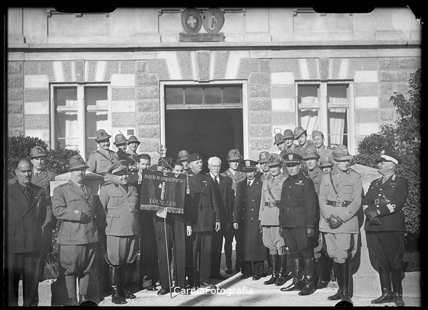 Ritratto di gruppo presso la Regia Scuola d'Arte Professionale “Albino Candoni” di Tolmezzo. Numerosi uomini posano con l'uniforme militare davanti all’ingresso dell’istituto. Un signore sostiene un gagliardetto dove, accanto al fasci littorio, si legge FASCIO DI COMBATTIMENTO/ TOLMEZZO. La fotografia è stata probabilmente realizzata al termine di una cerimonia. Sopra la porta d’ingresso si vedono due ovali: si distingue lo stemma del comune di Tolmezzo, a sinistra, e il tricolore italiano con un fascio littorio, a destra.